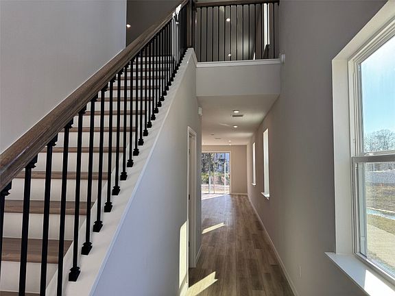 This spacious floor plan invites you with a dramatic entrance with the ceiling height. The kitchen is spacious and sunny with plenty of natural light coming in from the 8Ft Triple doorwall out to the covered patio and overlooking the pond. The primary suite is on the first floor and has a super shower. There is also first floor laundry and a half bath off of the kitchen. Upstairs, there is a large game room along with 3 other bedrooms and a shared bath.