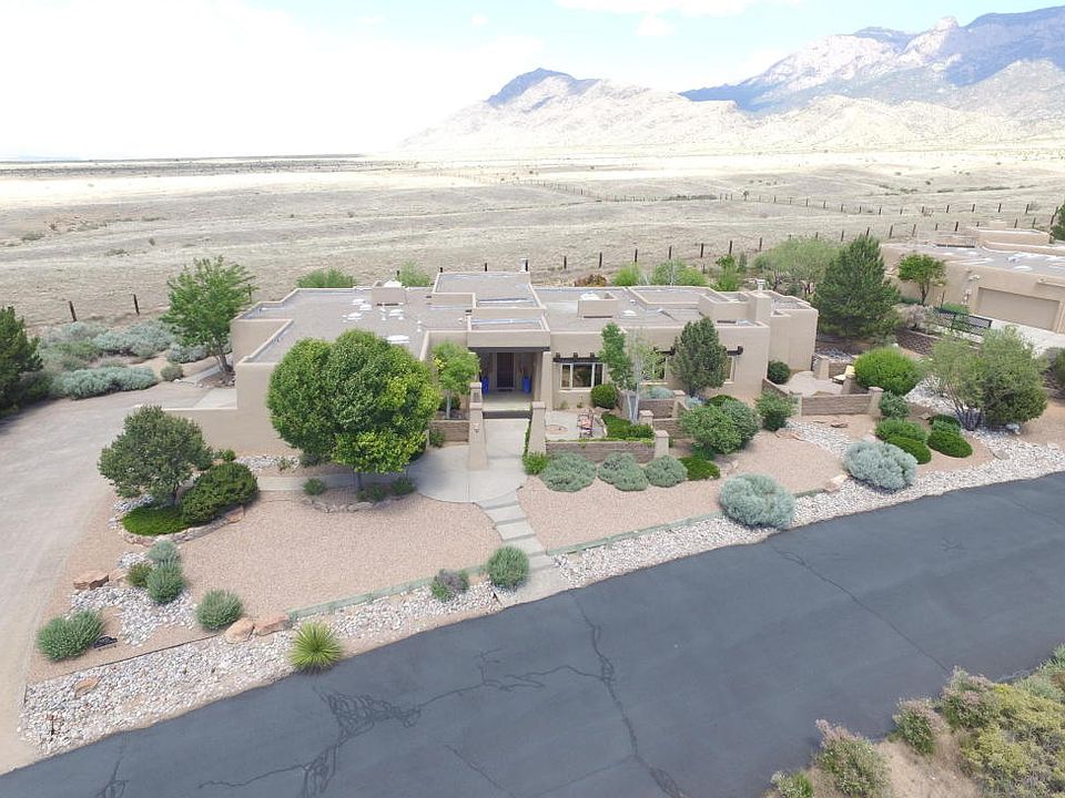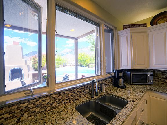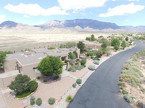 This southwestern masterpiece combines the comforts of fine living with the rugged beauty of the American West. Situated with a stunning vista of the Sandia Mountains, this home offers a cocoon of privacy and security inside the Sunset Hills gated community. The five bedroom, five bath residence makes wonderful use of the 4,000+ square feet, with a luxuriant master suite that includes a claw-foot tub, steam shower, and huge walk-in closets. The elegant kitchen is amply equipped with the finest appliances. The backyard borders the Sandia Pueblo Grant, where bison graze with their calves. Stationed next to the outdoor fireplace, the pool and spa accent the sumptuous interior. From the beam ceilings to the Pella windows, radiant heating, and water rights, this stunning property has it all!