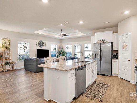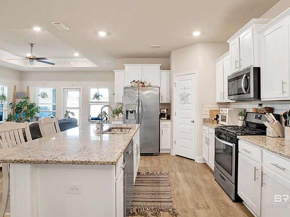 This home is located in Blackstone Lakes in Daphne and has a Community pool and 3 fishing lakes! The Isabella plan offers an open floor plan with kitchen overlooking the family room and dinning area. Home features a covered patio with a cable outlet for your TV. This beautiful 4 bed 2 bath home features: upgraded painted cabinets with cushion close doors and granite in kitchen and baths, stainless steel appliances including a gas range, a large island in kitchen that overlooks the family room, 5 ft. separate shower in master bathroom, walk-in closet, luxury vinyl plank flooring, 9 ft. ceilings with treys in Family room and Master, and a 2-car garage. Home includes Smart Home Package which includes control panel, doorbell, smartcode lock, two smart light switches, and thermostat, all controlled by one app. Buyer to verify all information during due diligence.