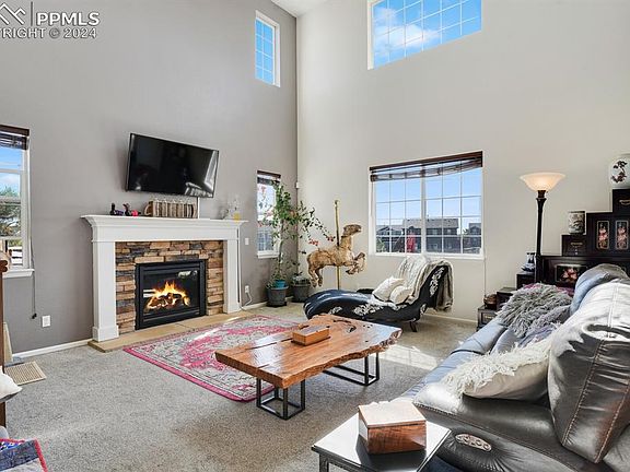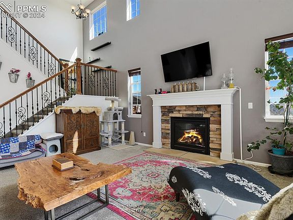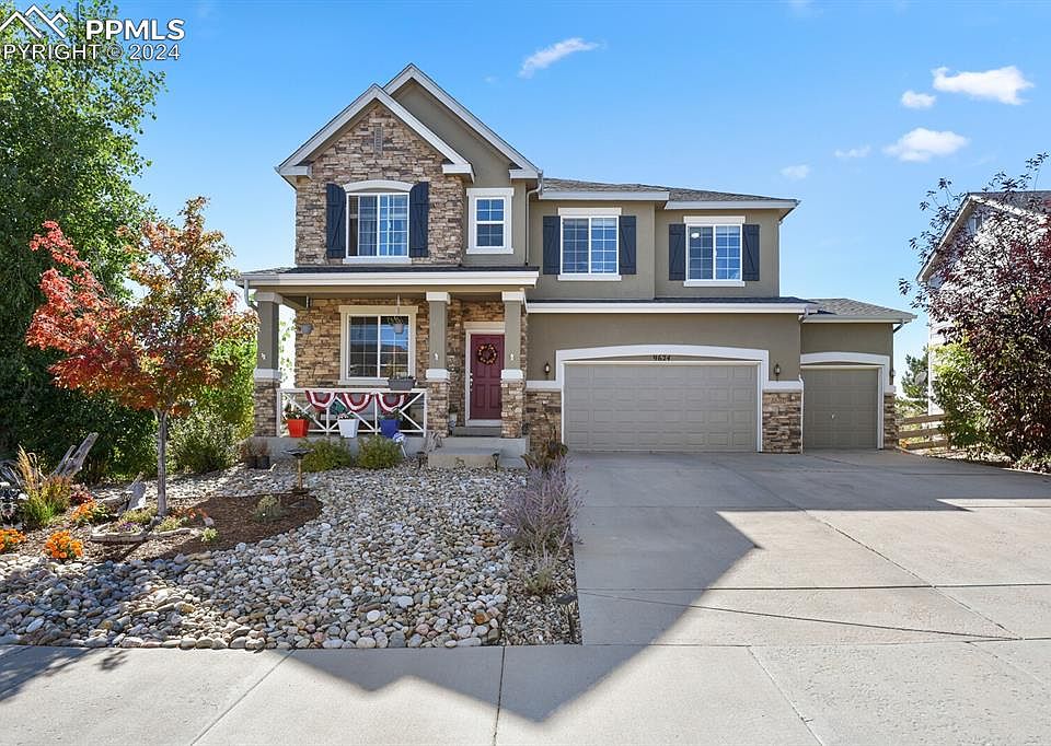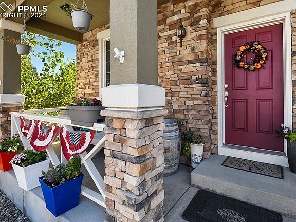 Welcome to this stunning former model home with great curb appeal and upgrades galore! This home has it all- with 5 bedrooms, 4 baths, 3-car garage with 220v, it sits on a huge landscaped .19-acre corner lot with Peak views! As you walk up you are greeted by gorgeous stonework and covered front patio. Enter in to a beautifully designed open floor plan, Great room with soaring ceilings and walls of windows and stone gas fireplace as the centerpiece. The kitchen boasts granite countertops, stainless-steel appliances including double ovens. High end finishes and upgrades are found throughout, subway tile back-splash, walk-in pantry with custom shelving, large granite island, and upgraded cabinets. The dining area walks out to the rear patio perfect for entertaining or relaxing. Enjoy the pergola with attached blinds and custom-built BBQ hut for grilling year-round. Main level office with classic French doors and custom built-ins, creates an ideal space for remote work or study. Walk upstairs and notice the classy wrought iron railing along the way. The generous upper level Master suite is a true retreat with panoramic mountain views, tray ceilings, a huge walk-in closet with new custom shelving and drawers, and an inviting 5-piece bath with double vanities and soaking tub. Three nice-sized bedrooms and full hall bath with double vanities and a conveniently located laundry room with folding table and cabinets finish off the upper level. The finished basement features a large family/recreation area, and an additional bedroom and full bath for family or guests. Need storage? The spacious bonus room will not disappoint. Extras include New roof and gutters installed in 2022, Central air, Radon Mitigation System, 220v in garage and fenced back yard with new sod and sprinkler system installed in 2023! Access to pool, clubhouse, golf course, trails and close to military bases. This Meridian Ranch gem has it all- come see it today!