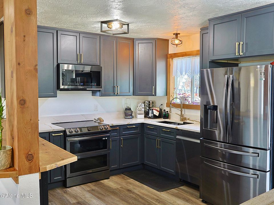Welcome Home! Just shy 2000 sqft, house offers a beautifully remodeled, eat-in kitchen with modern appliances, quartz counter tops, new cabinetry, light fixtures & flooring- complete with breakfast bar, opening up to a bright/cheerful living room w/cozy fireplace. Kitchen also opens directly out to an oversized deck offering sunset views-Great for BBQ/Entertaining! Main level includes 2 bdrms & full guest bath w/double sinks. Private Master Bedroom Suite located on lower level w/HUGE closet room & Lg. bathroom w/walk-in shower. The possibilities are endless in the spacious, Rec Room w/efficient wood stove, and access to the oversized, attached 35x24(approx.)garage/workshop. A sizable walk-in Laundry room completes the lower level. Gigantic, Fully-fenced backyard complete with 2 adjoining Garden Sheds totaling Approx.24'x18' of space. An open-style Gazebo makes a most fun summer gathering spot for parties & events! Super close to shopping & located in popular CDA School District.