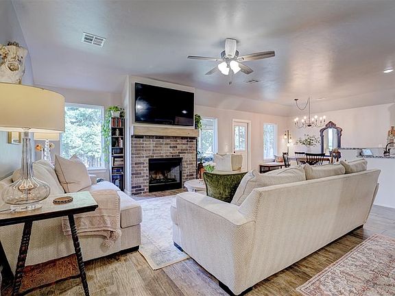 Welcome to this beautiful, nearly new home in the highly sought-after Rustic Creek Edition, nestled on a spacious 0.8-acre lot within Guthrie Schools. This stunning property offers an array of amenities, including 3 cm granite countertops, stainless steel appliances, and gorgeous wood-look tile flooring. With four bedrooms, two full bathrooms, and two living spaces, there is ample room for everyone. The large, open kitchen features a 10ft island with additional seating, custom cabinetry for generous storage, a subway tile backsplash, and sleek stainless-steel appliances, all flowing into the dining area and living room for an open and inviting environment. The living room is highlighted by a charming brick fireplace, a wood beam mantel, and large windows that flood the space with natural light. The primary suite boasts a spacious walk-in closet, double vanities, a luxurious soaking tub, and a separate shower. All secondary bedrooms are generously sized with plenty of closet space, and the oversized second bathroom features double vanities as well. Step into the patio to enjoy the screened-in 8x12 sunroom (not included in sq ft) with a ceiling fan, perfect for year-round relaxation. The backyard is a true oasis, complete with a darling chicken coop (chickens can stay with the right offer), a partial above-ground pool with a custom retaining wall, a fire pit with seating area, a dog run, a new fence, and freshly seeded grass. The property extends beyond the fence to a large, wooded area, with double gate access to the backyard. This home truly offers the best of both indoor and outdoor living!