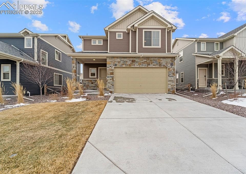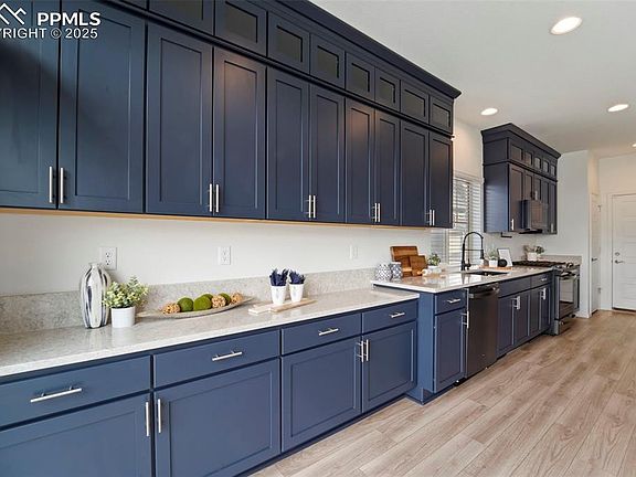 Experience refined living in this stunning two-story home, thoughtfully designed for upscale comfort. Boasting three generously sized bedrooms and three elegantly appointed bathrooms, this residence features a luxurious master suite complete with a spacious sitting area—your private retreat for relaxation. Step inside to an inviting open-concept layout, perfect for seamless entertaining. The gourmet kitchen is a chef’s dream, showcasing high-end matte black appliances, floor-to-ceiling cabinetry, and a sprawling center island that anchors the space. Sleek quartz countertops throughout the home elevate both style and durability. Luxury plank vinyl flooring on the main level adds a touch of sophistication while ensuring lasting beauty. Convenience is key, with an upstairs laundry room for effortless daily routines. Outside, the low-maintenance backyard is designed for year-round enjoyment, featuring artificial turf, an ideal escape for unwinding or hosting guests. Nestled in the prestigious Banning Lewis Ranch, this home grants access to premier community amenities and is zoned for the highly rated D49 schools, making it a perfect choice for those seeking a refined yet comfortable lifestyle. Experience the ideal blend of luxury, convenience, and modern elegance.