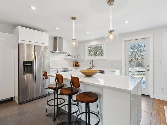 This beautifully updated mid-century ranch home in South Portland offers single-level living with a light-filled, open-concept floor plan. You will be welcomed by an airy eat-in kitchen, complete with a large island, and stainless-steel appliances. Perfect for both everyday living and entertaining, the kitchen flows into the inviting dining area and living room, which boasts a cozy wood-burning fireplace - ideal for those cool New England nights. Featuring 2 spacious bedrooms and 1 full bath, this home has been thoughtfully reimagined for modern comfort while preserving its timeless design. Plenty of built-in storage adds both convenience and charm throughout the home. The laundry area, conveniently located behind a stylish sliding barn door, leads directly to the garage - a versatile space that could easily be converted into additional living areas to suit your needs. Step outside into your large, private backyard, which offers scenic views of Mount Washington and is bordered by lush wooded areas. Enjoy the serenity of nature trails right outside your door, while still being just 10 minutes from the vibrant Old Port, offering shopping, dining, and entertainment. Freshly repainted and move-in ready, this home is conveniently located near Mill Creek, South Portland High School, and the Greenbelt Trails.