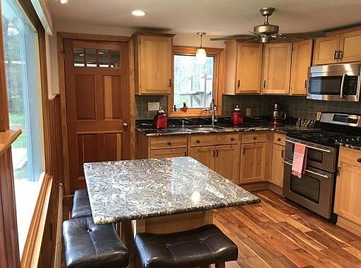 - Kit Dscrp: Ceiling Fan(s), Flooring - Hardwood, Countertops - Stone/Granite/Solid, Kitchen Island, Stainless Steel Appliances, Recessed Lighting, Wainscoting