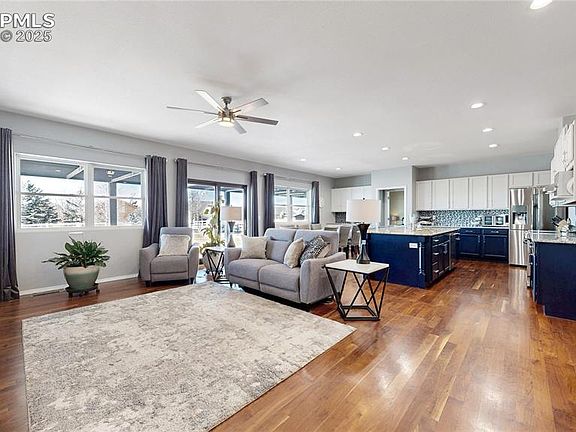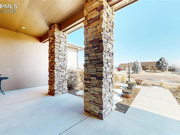 Welcome to this outstanding PRE-INSPECTED upgraded ranch-style home with Pike's Peak views with an ideal location beside a neighborhood park. Inside the front door, enter the attached apartment through the door on the left, with a living area, darling kitchenette, lovely bathroom, washer/dryer & a generous bedroom. Rain Glass French doors in the entry welcome you into the huge open great room that is "HGTV worthy" with gorgeous designer touches. Your eye travels from the living area with built-in gas fireplace and stone surround to the huge granite island, dining area to the kitchen with abundant granite counters & amazing storage. Room for many cooks! Even better, there is a butler pantry with even more counters, cabinets & a built-in pantry. You'll see the first of 3 laundry areas. The large isolated master suite looks over the huge patio, & has a 5 piece ensuite bath, and large walk-in closet. The main level is filled with light & overlooks that 54' x 16' covered patio with adjustable pergola vanes. The entire house is designed for entertaining, including the huge family room in the basement that has a wet bar, built-in Murphy bed, second gas fireplace, and even a sleeping nook! On one side of the family room you'll discover 2 beautifully appointed bedrooms with a Jack n Jill bath between them. The bathroom has a custom tiled tub/shower, a marble, modern vanity with underlighting, 2 sinks & extra storage. Each bedroom has designer light fixtures, abundant closet space and a lovely electric fireplace for ambience and warmth. One also has a hanging Rattan Chair that is included. At the other end of the family room is another suite with a huge bedroom, sitting area, large closet and third laundry room with custom storage units (included), and the 5th gorgeous bathroom with high-end finishes. Quality & attention to detail abounds throughout. Don't miss the energy saving solar system, 3 car garage & extra parking for cars & RV! Hurry!