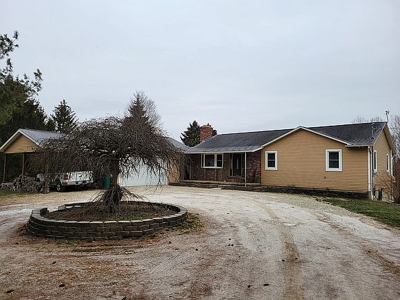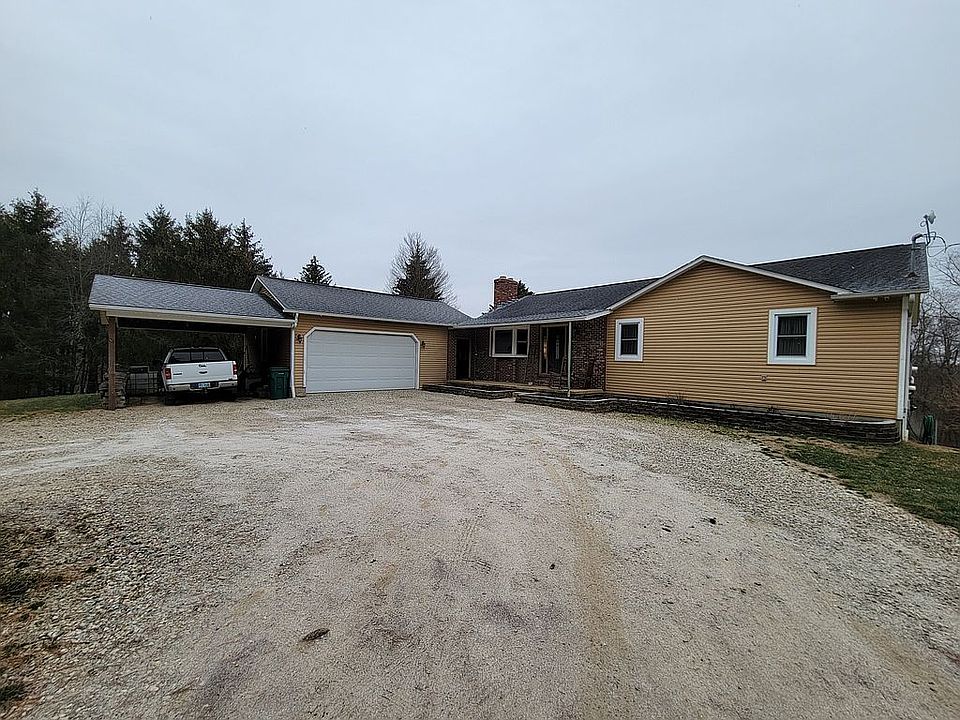 There is so much to love about this ranch style home with a walkout Lower Level. Situated on 4 secluded acres with beautiful views, this home has enjoyed nice improvements: Newer siding, roof, beveled front door, garage door, flooring, water heater, hvac, furnace, windows & dishwasher. Vaulted Living Rm with a beamed ceiling & a stunning floor to ceiling brick wbfp. Main bathroom completely updated. The open Kitchen is highlighted by a beamed ceiling, breakfast bar, skylight, SS appliances, Dining Room & Deck access - nice for entertaining! 3 main level Bedrooms, including an Owner's Suite with newer flooring (2017) and an attached, updated, private Bath. Fantastic walkout Lower Level with a wood burning stove offers versatile living area & Patio access. Oversize 2+ car Garage plus a carport. Plenty of storage in unfinished portion of the Basement. Must see!