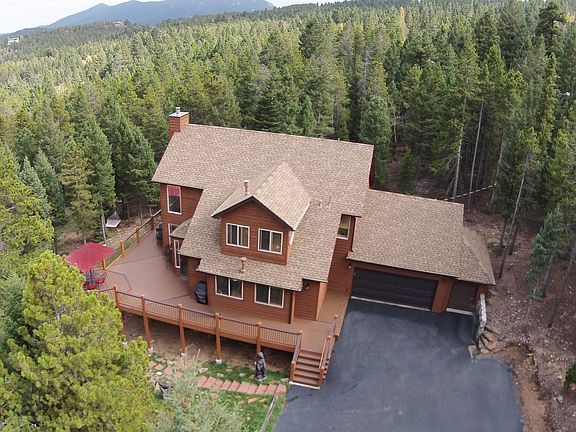 Absolutely gorgeous mountain home between Conifer and Evergreen in popular Shadow Mountain area! Rolling hills and trees, views of trees and hills and city lights! Trex deck runs the length and width of home, 2nd balcony off the upper master retreat, covered patio and covered deck off finished walk-out basement, land is easy to navigate, relax in your hammock, roast marshmallows on your built-in fire pit, or soothe sore muscles after a day on the slopes in your lighted, surround sound, covered hot tub! Inside the home features 4 fireplaces/stove, open 2 story great room with custom slab granite open kitchen, 2nd master suite on main level along with 3rd bedroom and full bath! 721SF upper private master retreat features sitting area with mtn views, balcony, loft area overlooking great room, large en-suite 5 piece bath and walk-in closet. Finished bsmt included large rec area, kitchen/wine room, bedroom, full bath and exterior entrance! Great for rent potential!!