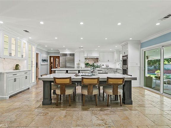 With one of the most commanding and impressive frontages to hit the market in years, this single-story ranch style gem sets the bar for Villa Park luxury living. Sitting on an elevated lot and boasting over 200 feet of frontage, this home stands alone when it comes to street presence. Enter through customs lead glass front doors to an elegant foyer and spacious great room. Stone finished floors, custom crown, stone base, neutral tones and open concept give this entry a warm and inviting feel. Gourmet kitchen is a culinary dream, complete w/ two tone custom cabinets, sprawling island w/ prep sink & bar top seating, dual farm sinks, high end SS appliances, double oven, 6 burner professional cooktop, custom hood, and scenic views of the sprawling back yard. Great room is open and expansive w/ large dining table space, glass inlaid custom hutch, and spacious & family room. The den/living room is a throwback to when craftsmanship mattered. Finished with floor to ceiling finished carpentry, architectural exposed beams, elegant and stylish built in bar, and stone finished fireplace wall w/ built in TV. Primary bedroom is HUGE and enjoys lots of natural light from an impressive lead glass inlaid front window. Large dual paned slider has easy access to spacious side yard. The primary bath was recently renovated with floor to ceiling porcelain, free standing soaking tub, dual vanity sinks w/ stone counters, dam free walk-in shower w/ rain head, custom fixtures, and a large walk-in closet. The spacious laundry has waterfall stone counter washer and dryer enclosure, custom cabinets w/ lots of upper cabinet storage and HUGE overflow pantry for kitchen or linen storage. Secondary bedrooms are open and spacious with custom base and case, neutral tones, and scenic picture windows. All secondary baths have been recently renovated and upgraded and are appointed with high end stone finishes, elegant cabinetry, custom fixtures, and functional layouts. The backyard boasts a sprawling layout with multiple areas for enjoyment OR expansion. An expansive patio cover, complete with custom pillars, ceiling fans, and recessed lighting gives way tons of grass and room to run. Raised garden beds are perfect for green thumb enthusiasts. Other features include 4 car garage, ceiling fans, window coverings, separate family room access, newer doors and windows, brick finished hardscapes, mature trees, covered front porch and so much more! Call immediately for more details!