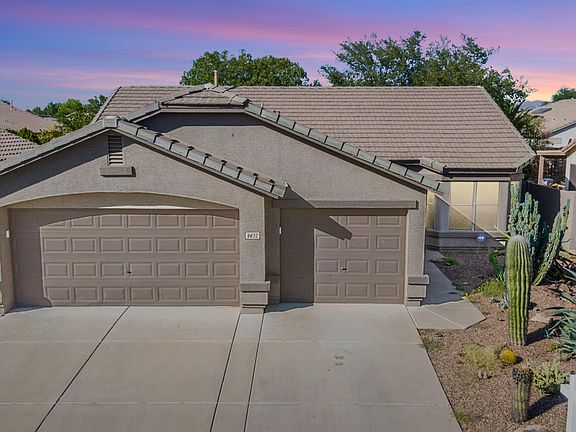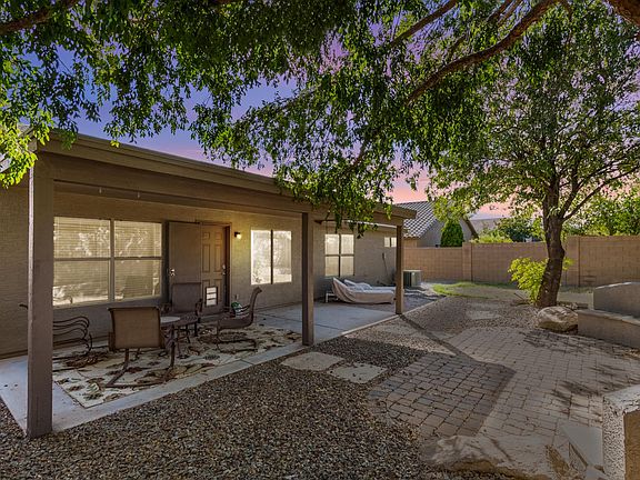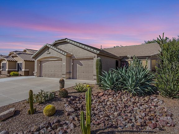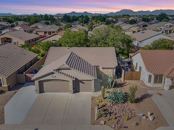 Great curb appeal Home in the Community of Mesquite Canyon. Soaring ceilings, beautiful wood engineered flooring, soothing palette, window blinds, ceiling fans, & bay window in living room. Charming family room offers built-in cabinets w/tiled backsplash, wine rack, upgraded lighting, & formal dining area. Center kitchen island, granite counters, breakfast bar, pantry, SS appliances, plant shelf, & lovely blue wood cabinetry w/hardware. Perfect Home for entertaining! Generous size bedrooms boasts wood plank tile floors, ample closets, & 2 upscale baths tastefully designed. Backyard extended covered patio, shade trees, & private setting. 3 Car garage! Community Playground. This gem in the desert will not last!