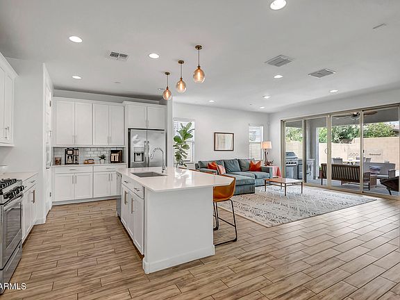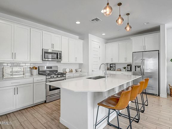 Upgrades continue into the bathrooms, where you'll find quartz countertops and clean white cabinetry and framed mirrors. The large primary suite is a peaceful retreat with a luxurious feel, thanks to the meticulously designed primary bathroom complete with Welcome to a rare gem in Cadence! This light and bright open floor plan home is not your builder basic property and offers many upgrades including: premium lot location, private pool, custom built-in outdoor kitchen with gas BBQ and beverage refrigerator, and a gas line stub for your future outdoor fireplace to enjoy under the stars. Other upgrades include: Neutral wood tile floors flow throughout the home, a large gourmet kitchen, featuring stainless steel appliances, quartz countertops, a chic backsplash, and elegant pendant lighting over the large island, perfect for entertaining.