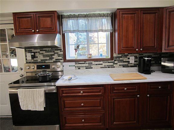 Ranch home features 3 bedrooms and a full bath room in the country. 3rd bedroom has been converted to 1st floor laundry but can easily be converted back. Enter through the front foyer to the large living room w/pellet stove that opens to eat in kitchen w/ cherry cabinets, new counters, ceramic tile backsplash, all newer stainless steel appliances included! Newer furnace and central AC, 200 amp electric service, replacement windows and gutters! Basement has been professionally waterproofed. Entire home has been newly insulated. Enjoy nature from the big, newer back yard deck with gazebo! Invisible pet fence, one and a half car attached garage, storage shed. Flat screen wall mounted TV, dog kennel in backyard and bathroom vanity and riding lawn mower in shed included with the sale. Home is being sold "As Is" no repairs based on a home inspection will be made by owner.