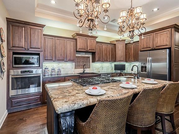 Welcome home to this pristine 3bed/3bath/3car patio home in the popular Maize South school district. A former model, this Promenade plan offers more upgrades than you can count. Inside, you'll discover gorgeous hardwood flooring throughout the common areas, the extra large casings and trim, and the advantage of abundant natural lighting. The living room offers a stone-faced gas fireplace, coffered ceiling, and exit to the fabulous outdoor patio and kitchen. The spectacular indoor kitchen features an extra large island, magnificent granite counter tops, reach-in pantry, gas range, copper sink, and a full set of stainless steel appliances. An adjoining dining area allows entertainment of large groups. The expansive main floor master bedroom boasts a coffered ceiling with dual fans, newer carpet, transom windows, and French doors to the patio/outdoor kitchen. The breath-taking en suite bath has an extended dual vanity, elegantly-tiled shower, and considerable storage. Completing the main floor are a second bedroom with ample closet space, office with upgraded plantation shutters and newer carpet, large laundry room with folding area and adjoining safe room/pantry space, and an impressive hall bath with shower/tub combo. Upstairs, you'll find a sizable media room with all equipment remaining. Also on this level, a private third bedroom suite with large modern bath and spacious storage closet make great space for guests or additional family members. Adjacent to the over-sized 3-car garage, you'll discover a huge finished storage area/work shop, adding to the large amount of storage inside this home. Mechanical upgrades include a zoned HVAC system, new water heater, extra insulation, RO water softener, and whole house surround sound. We aren't done yet. The outdoor living areas will blow you away! The enclosed, partially-covered patio is home to an extraordinary outdoor kitchen, offering attractive stamped concrete, a wood-burning stone fireplace, granite counter tops, and a full set appliances including gas grill. Additional exterior amenities include a rear tree line with no rear neighbors, cement siding, patio water fountain. The HOA dues cover a variety of easy living benefits, including lawn maintenance and watering, use of a modern clubhouse with work out room and community pool, trash, snow removal, and exterior painting. This home is located close to everything that Northwest Wichita has to offer. They don't come along in better condition at this price. Come see us today before you miss out! **See the promo video and the 3D Matterport tour for additional views of this home.**