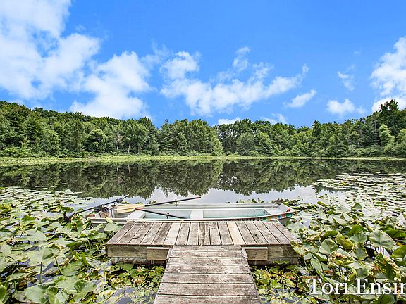 Play, hunt and fish all on your own land! Over 20 wooded acres on private lake Olin, stocked with fish! Main floor offers open kitchen with pantry and dining room. 2 Bedrooms and 1 full bathroom. Living room with cathedral ceilings and door leading to large deck overlooking property & lake. Primary suite is the entire upper level with walk-in closet and attached full bath. Walk-out basement is finished with 2nd living room, laundry and lots of storage space.