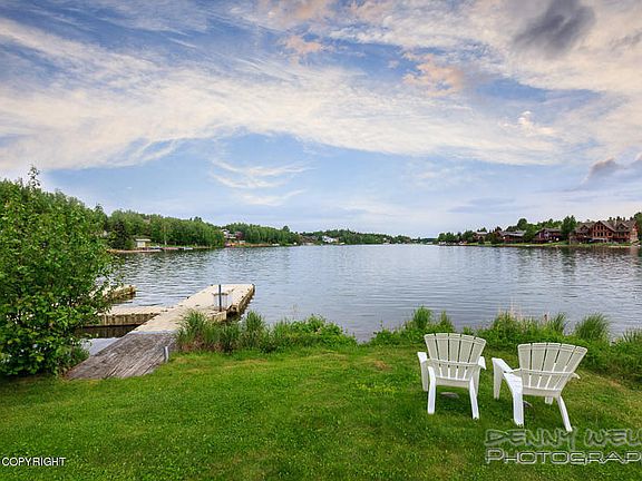 Gorgeous & rare treed acre lakefront lot at the east end of the lake, avoiding much of the floatplane take-off noise. Floatplane dock & lakeside storage shed. Beautiful solid walnut trim throughout the entire home. Gorgeous master suite w/ walk-in closet& steam shower! Home theater room. 1 BR MIL apartment w/ private access. W facing deck/patio & hot tub to enjoy the long AK summer nights w/ a vie