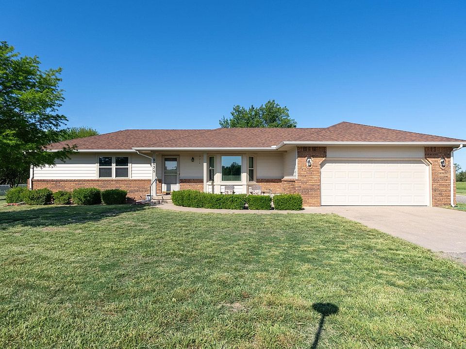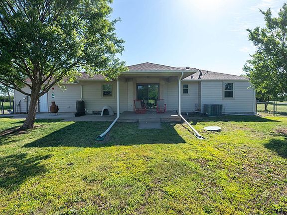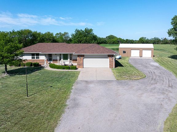 If your searching for a peaceful place to take your shoes off, you've found it! This home is nestled back off the road and offer's much privacy. Enjoy Kansas Sunset's on your covered patio! Your 2-car detached garage can house your toys or projects! It's obvious that there has been a huge amount of Owner Pride in this property. So many things to mention and there is a Seller improvement sheet online or I'm happy to supply and answer all your questions. Roof & Guttering new in 2023. Rebuilt lagoon/installed new septic tank, sewer lines and new lagoon fencing in 2019. Newer Patio sliding door. Water softener. New siding 2015. Driveway had new asphalt millings laid in 2020. Well pump in replaced in 2021. So many things!