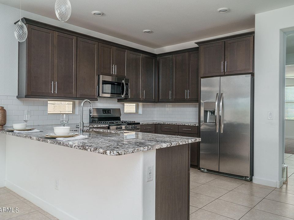 Welcome to this gorgeous single-story home in Sunset Farms boasting 5 bedrooms, 3 bathrooms, and a well-designed great room floorplan. The kitchen offers granite countertops, a peninsula breakfast bar with pendant lights, stainless steel appliances, stylish tile backsplash, and a double-door pantry. Plus, the water softener, stainless steel refrigerator, and washer and dryer convey! MOVE-IN READY! The great room offers a modern ceiling fan, recessed canned lighting, and a sliding glass door with a mountain view! The primary suite has double-door entry, and an ensuite bathroom featuring a tiled shower, dual sink vanity with granite countertops, and a walk-in closet. The remaining bedrooms are move-in ready with ceiling fans and blinds. Both bathrooms have granite countertops, and bathroom 3 has a dual sink vanity! The backyard is easy to care for with mountain views, a covered patio, and a paver extension for additional seating area. Do not miss out on this beautiful home!
