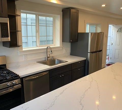 (Please note: I am a small owner-operator, so to save time, if you're interested in the apartment I ask that you send me a note briefly describing why you're moving, and what sort of job you have. If you don't do that, I won't have time to respond). Remodeled 4BR/2BA apartment with private rear outdoor yard in North Oakland, near the border with South Berkeley. Features include: - all brand new stainless steel appliances - brand new cabinets - nice large quartz island counter for eating - brand new grey oak hardwood flooring throughout - washer-dryer IN UNIT - 2 full bathrooms (shower only) - quiet street, in North Oakland near South Berkeley border; equi-distant between Ashby and Macarthur Bart stations (20 minute walk/5 minute bike ride). Close to Emeryville shopping, and San Pablo Ave retail. - private outdoor rear yard, with bonus "Casita" cottage/shed for extra guest bedroom, TV room, or remote office. Other factors to consider: - Lower unit of duplex - No offstreet parking, and street can get crowded - Cats ok/sorry no dogs - PG&E paid by tenant, water/garbage paid by landlord - 3/1 ratio of income/rent ratio required, with solid credit/references If this place is of interest, please send a brief note with a description of why you're moving, and what sort of job you have. Thanks!