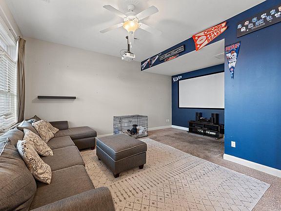 If you're seeking luxury in a prime location, look no further! This maintenance-free luxury three-story townhome offers the perfect combination of comfort and convenience. Centrally located, this property is just minutes from shopping, dining, entertainment, and allows easy access to Illinois for commuting. Enter through the covered front porch and into a spacious living room with built-in projector and screen- ideal for movie nights or game days. The first floor also includes a finished laundry room and direct access to the oversized 2.5-car garage. The second level features an open layout with additional living room that lends access to a large porch with pond views. The adjacent bar room features a custom-built bar and stools, while the eat-in kitchen boasts seamless stone countertops and backsplash, high-quality cabinetry, pantry, and ample dining space for entertaining. A powder room with custom pebble-stone flooring completes this level. The third floor is dedicated to privacy and relaxation. The primary suite includes a large walk-in closet with custom shelving and an en suite bathroom featuring double vanities with stone countertops, whirlpool tub, custom flooring, and tiled walk-in shower. Two additional bedrooms share a generously sized bathroom with another custom tiled walk-in shower and a stone-countered vanity. Throughout this home, enjoy the elegance of 10 foot ceilings, wide trim, recessed lighting, premium flooring, and high-end cabinetry, with plenty of opportunities to enjoy pond views from each level.
