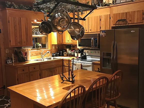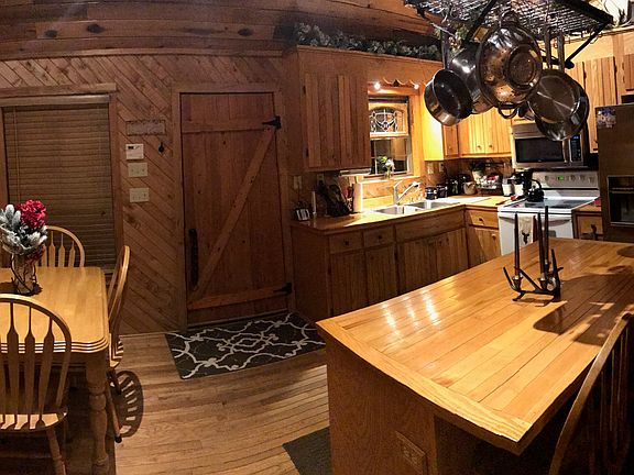 Beautiful one of a kind home! 11/2 story home with log cabin interior. Exterior is a vinyl siding with a wood look shipped in from out west. Two car garage. Wood burning fireplace with Buck stove insert. Open floor plan. Large front porch and back porch. Very peaceful location. Large yard with fenced dog lots, concrete pad with shelter over it. Home has been very well maintained! Call to schedule an appointment.