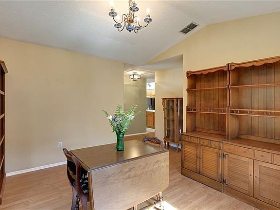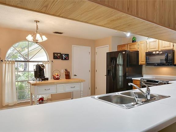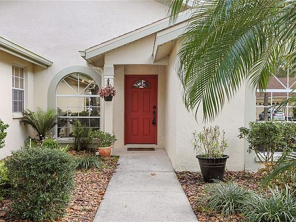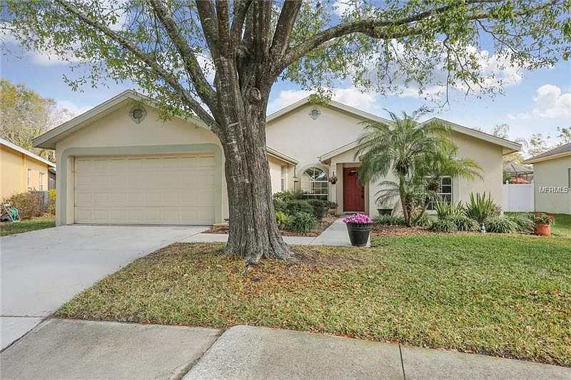 You are going to fall in love with this adorable one-story cottage with 3 bedrooms, 2 baths in the convenient Pebble Creek community in New Tampa. This home has a great split bedroom floor plan with volume ceilings. As you enter the home there is a spacious room to the right of the entry that could be a dining room.... or living room.... or office....... your choice! Large family room with wood burning fireplace opens to a screened lanai area and is adjacent to the spacious eat-in kitchen. The charming kitchen island stays with the house and the stainless microwave and range are new. The kitchen has lots of lighting! Easy care wood laminate flooring in entry, main living area, and master bedroom. Master suite has a huge walk in closet and the master bath has separate shower and tub, double sinks that were recently replaced, and brand new lighting. A small room between the kitchen and garage could be a mud room, pantry area, or even a small office. The fenced in yard will be great for privacy. Pebble Creek has NO CDD FEES and a low HOA fee. Yet he community amenities include a community pool and clubhouse, a public golf course, and Mulligans Irish Pub...a popular New Tampa tavern. Pebble Creek is in the heart of New Tampa where shopping and dining abound. This charming house will go quickly, so don't delay!