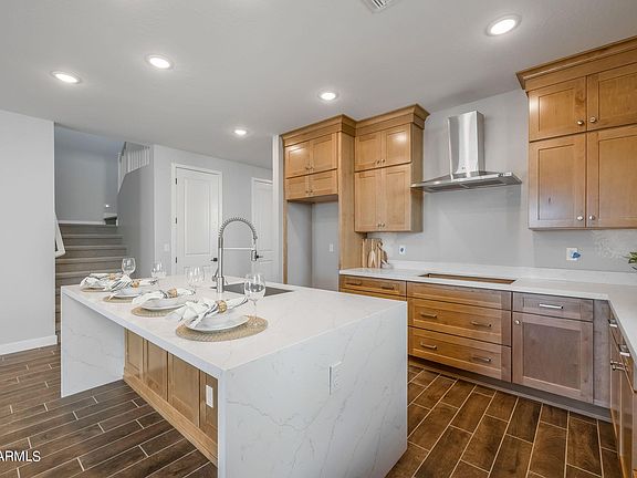 Experience the home of your dreams! This stunning 4 bedroom home with a den offers a perfect blend of elegance and functionality, starting with its captivating curb appeal adorned with lush artificial turf and a dreamy elevation. Step inside and be greeted by the warmth of the wood-look tile flooring that seamlessly flows throughout the main living areas and the high end berber carpet. The kitchen is a chef's delight, featuring natural wood-look cabinets reaching to the ceiling, modern hardware, and a sleek waterfall countertop. Convenience is key with pull-out recycle bins, and the stainless steel single-basin sink adds a touch of contemporary sophistication. (CLICK TO READ MORE) The owner's suite is a sanctuary with a dual vanity, tiled shower, and a lavish soaking tub for ultimate relaxation. Upstairs, a spacious loft awaits, providing an additional living space right off the two ideal sized bedrooms. Additionally this home boasts two-toned paint, a water softener loop, a 4 car garage, and high ceilings creating a stylish and cohesive atmosphere throughout. Just like a world class resort this community offers a luxurious community pool, splash pads, numerous parks spread throughout, the Steadfast farm, the Handlebar Diner, and its very own state-of-the-art clubhouse "The Mark". The Mark hosts events throughout the year and a wide variety of family friendly games to play. With its modern amenities and attention to detail, this property is not just a home; it's a lifestyle. Don't miss the opportunity to make this house your perfect home sweet home. Come see it today and experience the luxury of comfortable living!