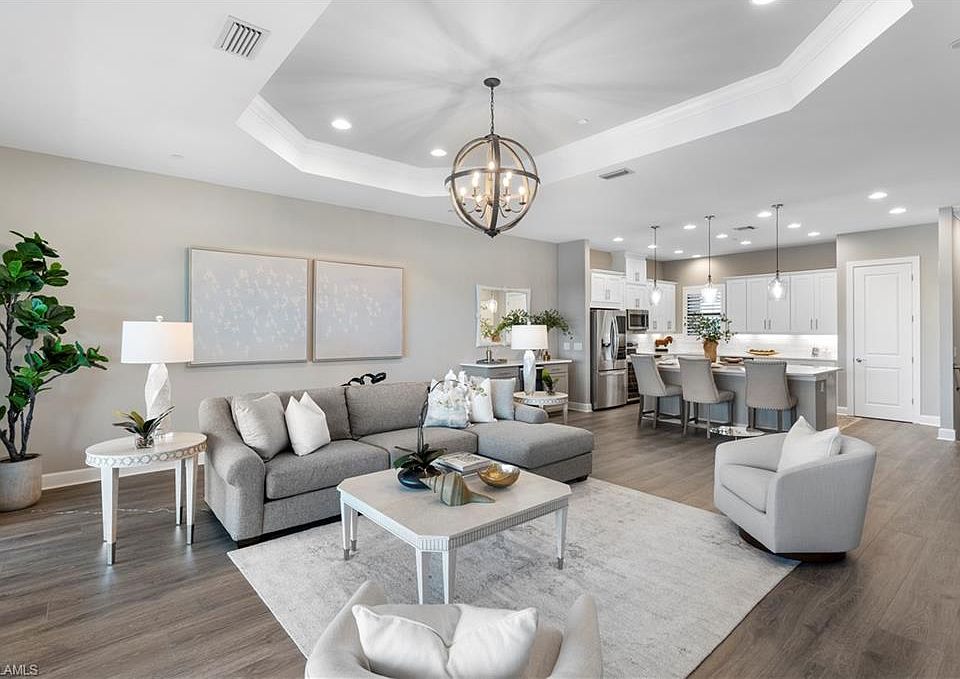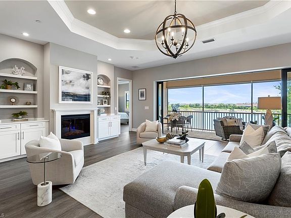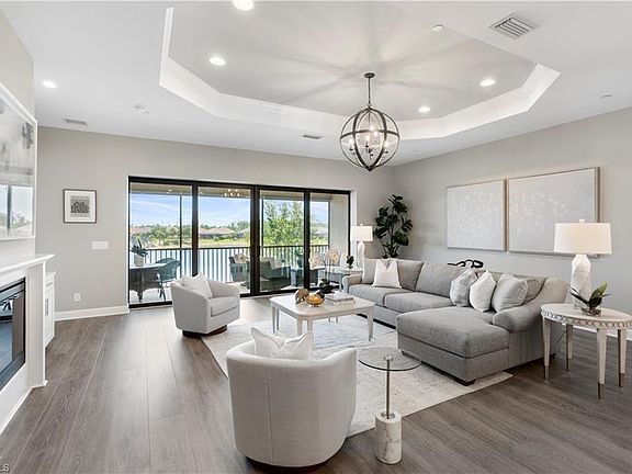 LIVE A VACATION LIFESTYLE IN ESPLANADE! This highly upgraded and immaculate “Bellisimo” 3 bedroom, 2.5 bath, 2343 sq ft coach home lives BIG with a wide open floorplan with generously sized great room, separate dining room, and spacious kitchen featuring Calacutta Laza quartz countertops, an abundance of cabinetry (with pull outs), pantry with custom shelving, under cabinet lighting, and stainless steel appliances including two wine coolers. Never miss a sunset from the west facing 23’x10’ lanai (with noseeums screens) which overlooks the lake, golf course, and bridge. A long list of special features include: HURRICANE IMPACT WINDOW/DOORS; 16’ pocketing sliding glass doors to the lanai; great room feature wall with LED fireplace, cabinetry, and shelving; luxury laminate flooring throughout the common areas and bedrooms (no carpet); white shaker style cabinetry with quartz countertops throughout; plantation shutters on all windows; custom dry bar with wine cooler; master closet, pantry, & storage closet custom shelving; crown molding & custom millwork feature wall; frameless glass shower enclosures; and more! This property is being sold partially furnished! Just one building away from the Montelanico pool! This property comes with a CLUB/SPORTS MEMBERSHIP which offers full access to all of Esplanade G&CC amenities including limited golf opportunities (2 day advanced tee times throughout the year). Esplanade is a true "Lifestyle Community" with something for everyone: resort pool complete with cabanas & poolside "Bahama Bar"; tennis; pickleball; bocce; Koquina Day Spa; fitness center; dog park; 14 miles of trails; 18 hole private golf course; restaurant, bar, wine tasting room, wine lockers, & Starbucks style cafe! Total monthly HOA/Club/Condo dues just $950/month which includes water/sewer, building insurance, building maintenance, and access to all of Esplanade's resort style living amenities! Add this property and Esplanade Golf & Country Club of Naples to your list today!