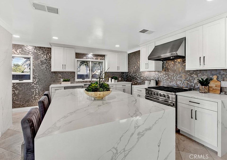 This stunning single-story pool house with built in BBQ is located on a corner lot of a quiet cul-de-sac. The front of the home impresses with immaculate artificial grass, a raised deck perfect for gatherings, a beautifully stained driveway with brick ribbon accents, a charming walkway, a tiled roof, and rain gutters. Inside, the home is fully remodeled to feature an expansive great room layout, highlighted by a large built-in fish tank wall. The chefs kitchen is a showstopper, complete with a spacious center island with sink, seating, and storage, along with quartz countertops, a designer backsplash and elegant white cabinetry. High-end stainless steel appliances include a professional-grade NXR gas range with six burners and range hood, a large farmhouse sink, and a stainless steel dishwasher. A well-equipped wet bar with a wine refrigerator, sink, and additional cabinetry adds the perfect touch for entertaining. The open living area boasts a custom tiled fireplace with a raised hearth and designer glass rocks, dual-pane windows, and glass slider doors that open to the backyard oasis. Throughout the home, you’ll find recessed lighting, extensive crown molding, high baseboards, and luxurious travertine flooring. Retreat to the private master suite, featuring dual closets (one walk-in) and a fully updated bathroom with custom cabinetry, dual sinks, and a walk-in shower with glass doors. Each guest bedroom is generously sized, complete with ceiling fans, crown molding, and recessed lighting. The updated guest bath features granite countertops, custom lighting, and a tub/shower combo with glass doors, plus there’s an additional half bath near the kitchen and garage for added convenience. The finished garage features Automatic movie screen projector, epoxy floors and painted drywall. Step into your backyard oasis, where a sparkling pool, stained concrete decking, Aluma-wood patio cover, and a BBQ island with a sink, BBQ grill, and beer tap await. Artificial grass surrounds the pool area with a 3-hole putting green and colorful mural walls that make this yard a true retreat. Located close to beaches, top schools, shopping, entertainment, medical centers, John Wayne Airport, and freeway access, this home offers the ultimate in convenience and luxury. Come see all the incredible features this home has to offer!