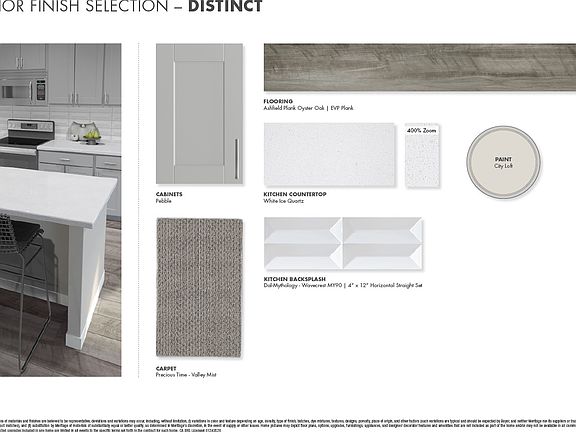 The first floor bedroom with adjacent bath is great for guests, and the upstairs loft is the ultimate flex space. Pebble cabinets with white ice quartz countertops, oyster oak EVP flooring with greyish brown patterned carpet in our Distinct package.
