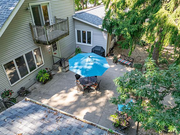Welcome to your private retreat on 2.5 wooded acres! This spacious 5-bedroom, 4-bath home blends rustic charm with modern comfort and plenty of room to spread out. A huge screened-in front porch greets you, perfect for morning coffee, relaxing evenings, and enjoying the peaceful surroundings. Inside, the vaulted living room with a wood-finished ceiling, skylights, and oversized windows fills the home with natural light. A stunning floor-to-ceiling brick wall with a wood stove adds warmth and character. The light and bright kitchen features abundant cabinetry, a tiled backsplash, and a cozy breakfast nook, opening to a formal dining room with a large picture window overlooking the backyard. The upstairs primary suite is a true retreat, offering vaulted ceilings, a walk-in closet, and a private balcony with scenic wooded views. The ensuite bath includes a Jacuzzi tub and double sinks for a spa-like experience. The finished basement expands your living space with a rec room, brick fireplace, built-in shelving, wood-burner grill, second laundry area, full bath, and abundant storage. Outside, enjoy an expansive patio, fenced yard, raised garden beds, and chicken coop, ideal for hobby farming or backyard fun. The large barn includes a loft, office, storage room, stove, shelving, and concrete floors, perfect for a workshop, home business, or extra storage. Recent updates include a new roof, gutters with guards, premium boiler (2025, $10k), AC (2024), newer windows, and carpet (2023). This property offers wooded privacy, scenic views, and quiet country living just minutes from shopping, schools, and highways.