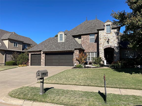 WELCOME HOME to this breathtaking home in the highly sought after, Legends! Spacious floor plan w/extensive hardwoods. Meticulously maintained! This home offers 6 bedrooms (4 up & 2 down) and 3 full bathrooms! The lower level features a formal dining and dedicated office off foyer. Open concept living room and kitchen. Primary and second bedroom on main level. A magical outdoor oasis provides open air dining, wood burning fireplace, and an AMAZING saltwater pool/hot tub combo (installed 2016), with a stunning stacked stone waterfall feature! The hot tub heats the pool in appx. one hour. Outdoor fireplace lets you enjoy the patio year round.Upstairs features one room that could be used as a game room, theater room or an impressively oversized bedroom and the other could be used as a den or workout room with a separate storage area for all your seasonal decorating needs(both of these rooms double as a bedroom), and two more bedrooms! Patio furniture stays! Gorgeous landscaping with sprinkler system. AND to boot, this one had a new roof installed April 2023!!!! Tulsa address, Bixby Schools.