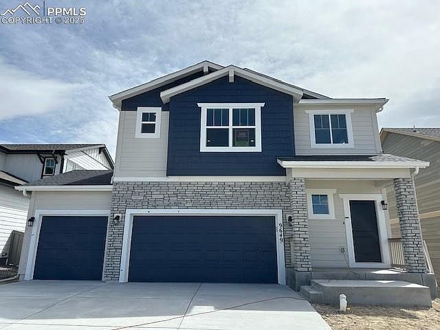 Ready in April. Mesa 2-story plan in Homestead at Sterling Ranch. 4 bedrooms, 2.5 baths, 3 car garage home. Cottage style exterior. Kitchen features Shaker-style cabinets in a shale gray paint, elegant Bianco Tiza Quartz countertops, island, pantry, and KitchenAid black stainless steel appliances including a gas range and refrigerator. Enjoy the convenience of a built-in mud bench at the owner's entry from the garage. The upper level hosts a primary bedroom separated from the three secondary bedrooms to create a serene, private space. The primary bathroom features a large shower with seat, vanity with double sinks, walk-in closet and separate linen closet. Home comes equipped with a smart home package, radon mitigation system, and air conditioning. Exterior living space includes a patio easily accessed from the dining area and includes a gas line suitable for a grill. Seller incentives available.