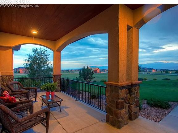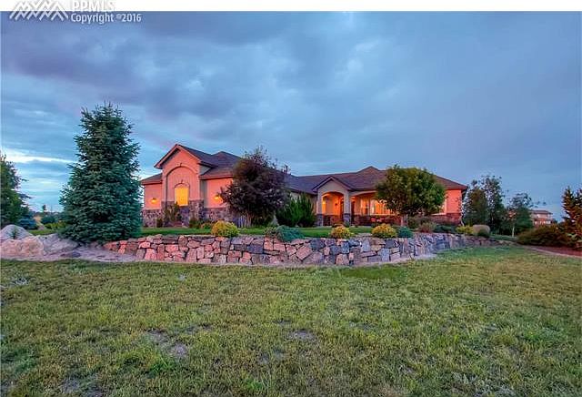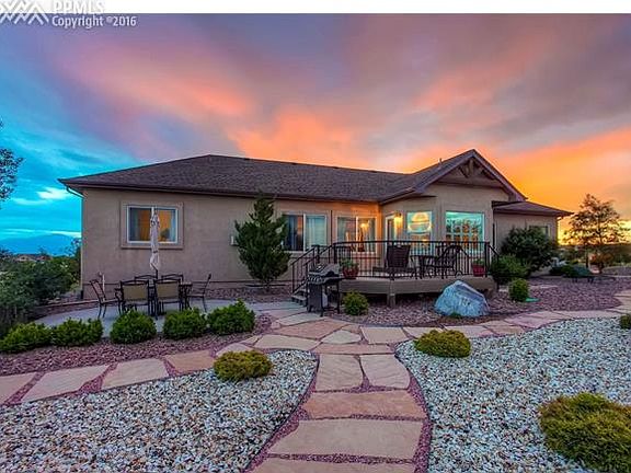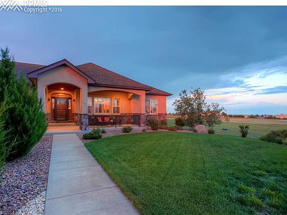 Welcome to this stunning rancher on 2.85 gorgeous acres w/stunning views of the Rocky Mountains & the famous Pikes Peak. This custom features high-end finishes such as hand-trowelled & coffered ceilings, granite counters, niches, outdoor-living, theater room, & attached 4-car garage! Other features include A/C, landscaping, detached 998 sf RV/car garage, gourmet kitchen, finished basement w/9??? ceilings, 2 furnaces, 2 50-gallon water heaters. HOme is mins from shopping & golf, 15 mins to Colo Springs & 50 mins to Denver! Walk though the lush front yard & large, covered patio that faces the mountains for peaceful resting. The entry with hardwood floors leads to the huge living room with vaulted ceilings, gas fireplace with stone surround & hearth, & built-in niches. The chef???s kitchen overlooks the living area for ideal entertaining & sight-lines. With hardwood floors, upgraded, dual tone cabinetry, huge island, ss appliances (including double ovens!), solid-slab granite countertops paired with stone backsplash, & a spacious nook, this kitchen offers it all! A walkout to the deck from the nook is ideal for grilling & outdoor tranquility. Archways lead to the large formal dining. The main also provides 2 secondary bedrooms (which can provide an office), a full bath, a half bath & laundry. The master suite is huge & offers a 5-piece bath & walk-in closet; the shower features dual showerheads for luxurious appeal. Downstairs is a large open area ideal as a 2nd family room, recreation area & more! Equipped w/ a wet bar & home theater, this level is also ideal for entertaining. Finishing the basement is a 1/2 bath, full bath & 2 large secondary beds (one has walk-in closet). Enjoy the great outdoors on the back patio w/natural & landscaped surroundings. This home is a must see!