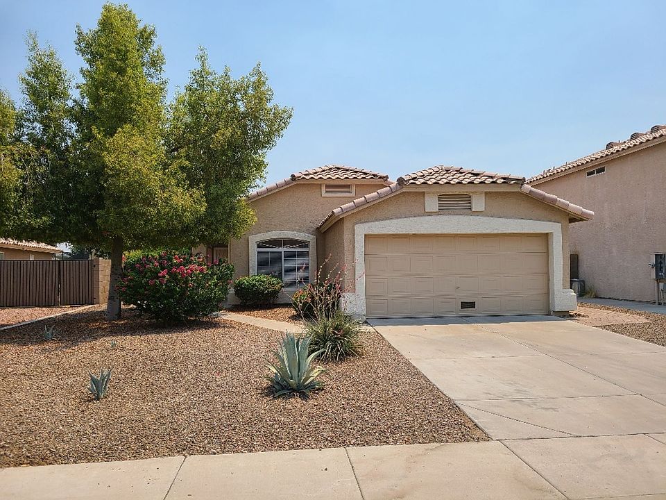 THIS 3 BEDROOM 2 BATH HOME HAS LIVING ROOM WITH CEILING FAN, EAT IN KITCHEN WITH REFRIGERATOR FOR CONVENIENCE ONLY, BREAKFAST BAR, MASTER BEDROOM HAS CEILING FAN, 3RD BEDROOM HAS WALK IN CLOSET! INSIDE LAUNDRY-WASHER/DRYER HOOKUPS, COVERED PATIO, BRICK WALKWAYS IN BACKYARD, STORAGE SHED, RV GATE, DESERT FRONT AND BACKYARDS, FRUIT TREES AND SHADE TREES. CLOSE TO THE 101 LOOP, ENJOY WESTGATE ENTERTAINMENT DISTRICT WITHOUT THE NOISE AND TRAFFIC. SMALL DOG MAYBE CONSIDERED, CAT MAY BE CONSIDERED.