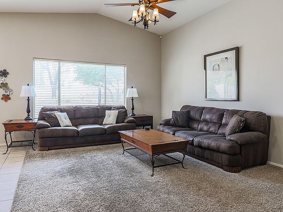 A mature tree shades the carefully landscaped front yard of this Tolleson home. Inside, an arched doorway creates a dignified entry to the large office. Vaulted ceilings soar over the kitchen and family room, a perfect place for entertaining. In the kitchen, dark counters and matching black appliances are a lovely contrast to the beautiful wood cabinets. Recessed lighting and upgraded ceiling fan and dining room fixtures add an elegant air to the space. A counter top island and bar connect the two rooms and create extra seating. All the bedrooms are spacious with large closets. The master bath has a spa-like feel with its large tub and glassed-in shower. Out back, a gorgeous curved pool with a flagstone patio provides the perfect way to keep cool in the summer!