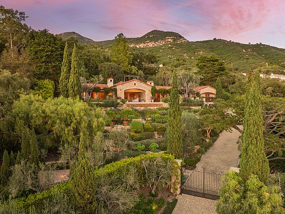 The property features beautifully terraced rose-filled flower gardens set among stately cypress and olive trees creating a serene and private outdoor setting. A stunning infinity-edge swimming pool and spa enhance the home's seamless indoor-outdoor lifestyle.