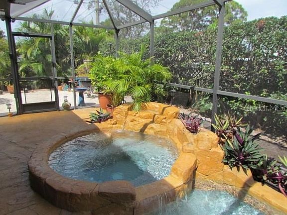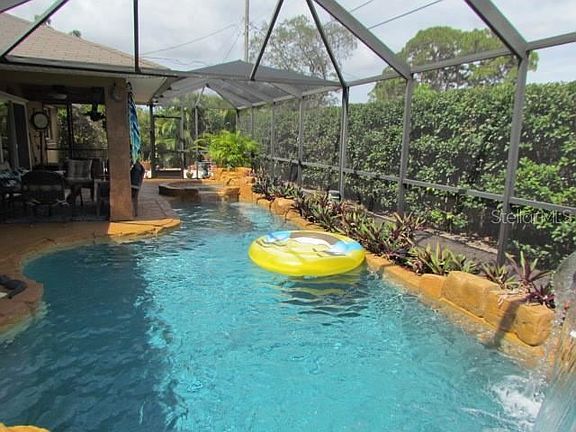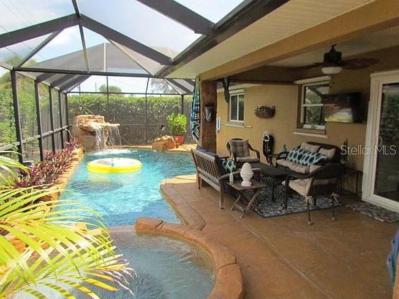 *** PRETTY PRETTY PRETTY *** Updated pool home with 3 true bedrooms and 2 full baths, 2 car garage and the most SPECTACULAR POOL you have ever seen in a private residence. Feel like you are living in a Disneyland Resort every day. Heat pump and solar heated SALT system totally custom pool includes a spa with waterfall, and built in drink cooler at one end, and a full waterfall feature at the other end, with plenty of room to swim your laps in between. Very dramatic WOW factor that you simply must see in person. But let's go back to the beginning: beautiful curb appeal, with a tiled front entry and extra wide, extended driveway for all your toys (RV, trailered boat? Jet skis?). Step into a HUGE living room with high ceilings and plenty of space for your very BIGGEST TV and sectional couch (pre-wired for surround sound - ask about the high tech equipment available for purchase to make your personal home theater experience complete). The living area flows nicely into the dining area and open kitchen. And what a kitchen! Tumbled Italian Marble counters, fresh white cabinetry, stainless steel appliances - of course. Smart, split floor plan, with the Owners suite and updated private bath (and walk in closet) on one side of the home, and the guest wing with 2 graciously sized bedrooms and an updated guest bath on the other. Solid surface (tile and wood laminate) flooring throughout - NO CARPET here. Did I mention double pane windows and sliders overlooking the pool? Plus hurricane shutters, for a "belt and suspenders" feel of safety for you and your family. Outside you will enjoy a PRIVATE fenced yard, and spacious paver patio outside the lanai - perfect for a fire pit or brick pizza oven. Cozy screened and covered lanai area is just the place for lounging or entertaining, or dining al fresco. Outdoor shower stall that adds to the Bali Resort feel. The pool boasts a newer pool pump (2019) and filter (2021). The A/C is 2021. And, yes, the workbench and peg board system stays with the house. NO HOA rules or fees. NO CDDs. NO City taxes. This home is immaculate and move in ready - and just over 4 MILES TO SHARKY'S on the BEACH. Don't forget the option to join a community boat ramp and/or private beach ferry. Isn't this exactly what you were looking for? Resort style living in your own back yard.