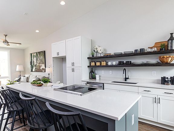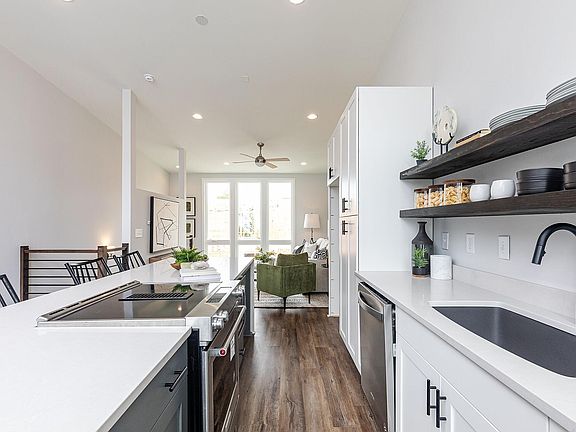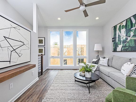 The Welkin plan features our Everday Beautiful Design Collection with matte black finishes throughout. Top-floor living with desirable design features including vaulted ceilings up to 14 feet and oversized casement windows providing natural light and city views. The gourmet kitchen features a 10-foot island with quartz countertops, and the top-floor kitchen and living areas spill onto the covered loggia, offering an outdoor entertainment setting. Hardwood stair treads and hard surface flooring run throughout the main living spaces. The middle floor features two bedrooms and two baths. The first floor offers an optional study with full bath, closet, and a private 1-car garage.***Photos are a representation of the home for sale, that is under construction. Colors and materials may not be as shown***