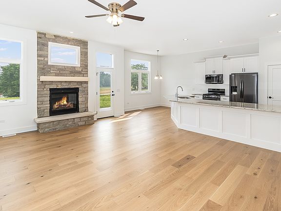 HUGE PRICE REDUCTION! Welcome to your dream home! This stunning NEW CONSTRUCTION, single level, 3 bdrm, 2 bathroom abode is situated on a spacious corner lot, offering ample outdoor space and charming curb appeal with its captivating stone exterior. With a 3-car garage, you will have plenty of room to park your vehicles and store your belongings. Step inside, and you'll be greeted by an inviting open concept living area that seamlessly connects the living room, dining room and kitchen. The interior features white oak engineered hardwood flooring, providing both durability and elegance. The kitchen is a chef's delight, boasting sleek granite countertops that add a touch of luxury to the space. The white shaker cabinets provide an abundance of storage, giving you a clutter-free cooking experience. Whether you're entertaining guests, or preparing a fabulous meal, this kitchen is sure to be the heart of the home. As you enter the living area, you'll find a cozy fireplace, creating the perfect ambiance for gatherings and creating lasting memories with loved ones. The fireplace serves as a focal point, providing a sense of comfort and warmth during those chilly evenings. The primary suite is a true oasis, offering a generous space and a huge walk-in closet to accommodate all your wardrobe needs. The en suite bathroom is a spa-like retreat, complete with a standalone soaker tub for unwinding after a long day. Additionally, the double vanities ensure ample space for everyone to get ready for the day. But that's not all! This home comes with a FULL unfinished basement, offering an impressive 2,200 more sq ft. of potential living space. Customize it to suit your needs, whether it's a home theater, extra bedrooms, playroom, a home gym, or all of the above! The possibilities are endless. As you venture outdoors, you'll be delighted to discover a beautiful view of the water, creating a peaceful and picturesque setting. Imagine sipping your morning coffee on the patio while overlooking the serene backdrop. For the golf enthusiasts, you will be pleased to know that a fantastic golf course is conveniently located nearby. Spend your weekends perfecting your swing. This CUSTOM NEW CONSTRUCTION home offers the perfect combination of luxury, comfort and location. With its thoughtfully designed open concept living space, high-end features, and the potential for additional living area, this residence truly has it all. Don't miss out on this opportunity to make this your forever home! Schedule a viewing today and let us help you take the first step in making your dream a reality.