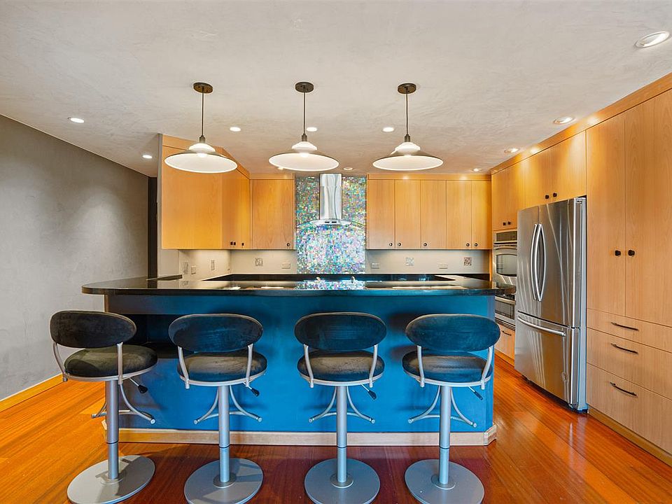 Impressive transformation! Top floor 2 bedroom, 2 bath, end-unit near Alameda Beach, this home is defined by its artistry and top-of-the-line upgrades with reconfigured space that creates an open entry and a stunning, full-size kitchen. The Venetian plaster-like walls add warmth and sophistication to the entire space. The backdrop of the kitchen is floor to ceiling modern cabinetry with sleek, black granite counters and a sophisticated breakfast bar with an inset black sink that faces the living room. Designed for entertaining: you can cook and serve cocktails to guests sitting at the bar height counter. No detail has been overlooked in this remodel. There are natural wood and glass doors throughout, engineered wood flooring, new carpets, custom fit wide slat blinds, built-in speaker wires, high end appliances, and more. The living room has a gas fireplace that provides all the heat you need & a small balcony w/ sliders for fresh air. Located on the bend of Shoreline near Crown Beach.