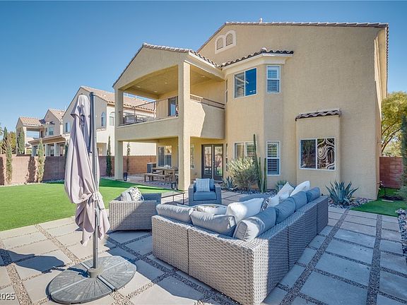 MOVE IN INCENTIVES AVAILABLE!! CALL TO INQUIRE! - Gated single family home with 4 bed 3 baths & 3 car garage in prime Henderson location. Covered entry opens to cathedral style dining room with wood-like flooring & open staircase with wood & wrought iron banister. Upgraded kitchen with tile backsplash, breakfast nook, and stainless steel appliances. Separate cozy family room leads to highly upgraded, spacious, rear yard with covered patio, fireplace, river walk and synthetic grass. Double entry to primary bedroom with vaulted ceilings, private balcony and en suite oversized bathroom with dual sinks, separate soaking tub, walk in shower and closet. Fourth bedroom can be an optional bedroom or office. Shutters & ceiling fans throughout.