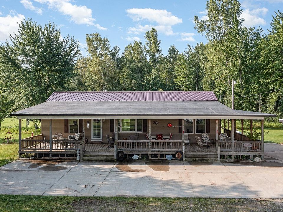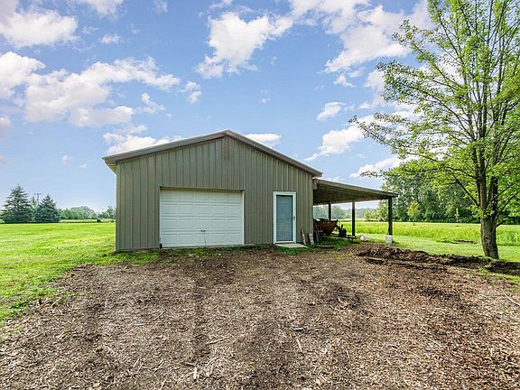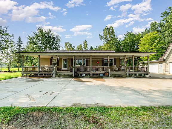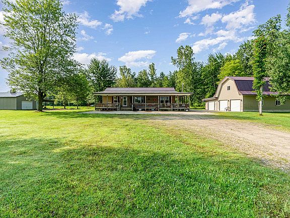 Beautiful country location with an open concept ranch home built in 2010 This home features 3 spacious bedrooms, 2 full bathrooms, and a primary suite, all with walk in closets The large kitchen with peninsula seating seamlessly flows into the living room, perfect for entertaining. Set on nearly 10 wooded acres, the property has so much to offer in a serene setting and boasts an oversized covered front porch for relaxing and two insulated outbuildings. A 24x32 structure with a lean to, and another 24x32 outbuilding with full loft and an attached 17x32 space which offers abundant storage. Other features include metal roofs on the house and pole barns from 2018 and septic tank and well within the last 5 years. This ideal country home is a must see, schedule your private showing today
