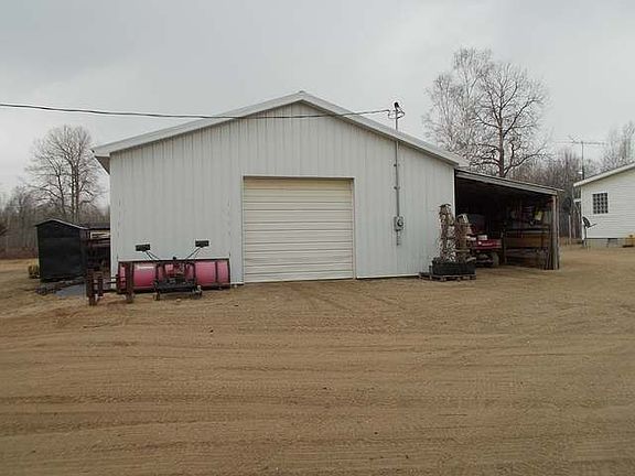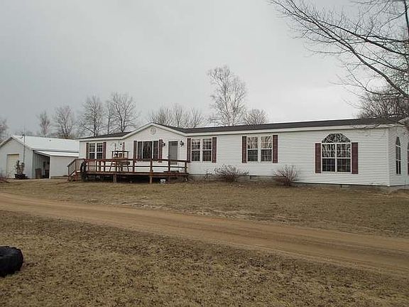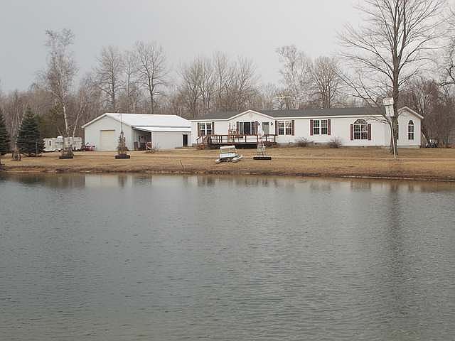 Country living at it's finest. This large 4 bedroom home has cathedral ceilings, a huge sunken great room with a real wood fireplace and a 12x40 covered patio that can be enclosed in the winter. The home and hot water are heated entirely with an outdoor wood furnace enclosed in a 12x24 wood shed for easy filling once a day. Flip a switch and change over to the propane furnace and water heater. One pond is approximately an acre and the other is about 2 acres and plenty deep to hold the bluegills, walleye, pike and other fish all year round. This would be a great home for the person with a large family or grandkids who like to swim and fish. The hunting is excellent and up to 58 more acres can be bought with this home. Lots of buildings if you are interested in raising animals. The deer and turkeys come right in the yard.