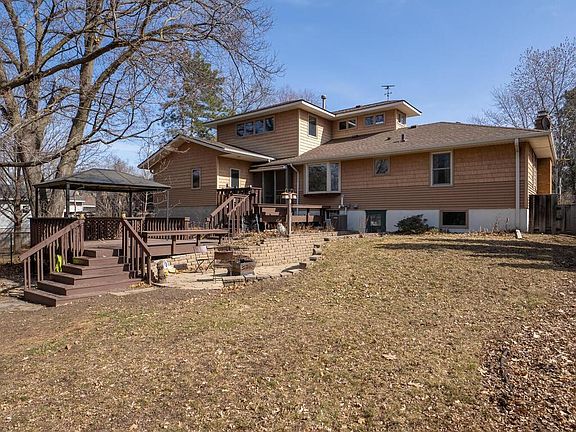 Beautifully updated home with newer windows! 3+ car insulated garage-9ft ceiling and 8ft doors! Main floor bedroom. Spacious living room with gas fireplace. Updated kitchen features gas stove and custom cabinets. Huge Owners Suite upstairs features walk-in closet , walkthru bathroom with walk-in shower, jetted tub and dual sinks. The 2nd bedroom upstairs 17ft x13 ft! Windows, water heater, central A/C replaced 2020. High-efficency Carrier furnace installed 2019. Cozy family room downstairs features newer LTV vinyl plank flooring, gas fireplace , flat screen TV and a wetbar. Lower level walks out to private fenced backyard with multi-level deck, gazebo & stone patio - perfect for entertaining!! MN River Valley trails closeby for walking/biking! Roof 10 years old. Garden shed too!