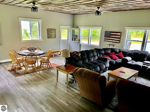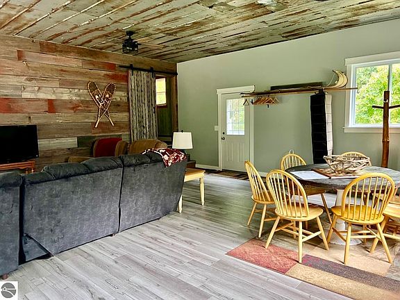 Snowmobile and Side by Side Up North Getaway Renovated 3 bedroom ranch located in beautiful Lakes of The North recreational community. The home is located on 2 large lots. Home features a large living room with fireplace, and a newly renovated 22’x22’ separate rec room with fireplace and plenty of space for entertaining. Great location on a paved road and within walking distance to Lake Harold and also less than ½ mile from the clubhouse pool and snowmobile/ Side by Side trails. The large circle driveway accommodates many trucks and trailers which leads to a huge 40’x64’ pole barn with a separate 200 amp service, updated LED lighting, work bench, and pallet racking to store all your toys! Pole barn is also plumbed for a future bathroom. Attached to the pole barn is a 12’x32’ lean-too, used as an outdoor kitchen during the summer and snowmobile parking in the winter. House is to be sold fully furnished and move-in ready.
