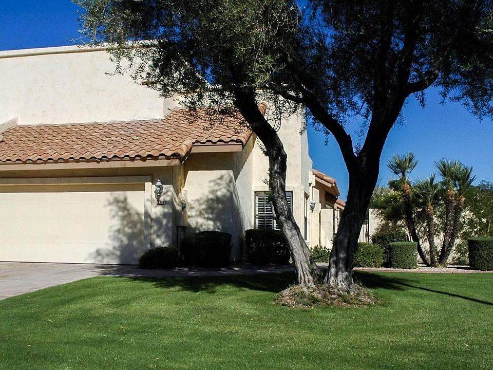 This beautiful & highly upgraded home is located in the heart of Scottsdale. Enter through the new double entry doors & experience the vaulted ceilings, travertine floors, plantation shutters throughout. With over 2000 sqft, this home is one of the few in Sweetwater Ranch Villages to offer 3 beds, 2.5 baths, large family room w/new French doors & fireplace, PLUS DEN. The kitchen was remodeled with new cabs & SS appliances. The downstairs master has newer bath & new French doors to the patio. Upstairs you will find 2 beds, updated bath, & den/office. With one of the largest lots in SRV w/ no homes behind or to the side, the yard includes private pool, paver patio, BBQ area, multiple sitting areas, & gorgeous mountain views perfect for entertaining. SRV also offers its own heated pool & spa.