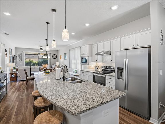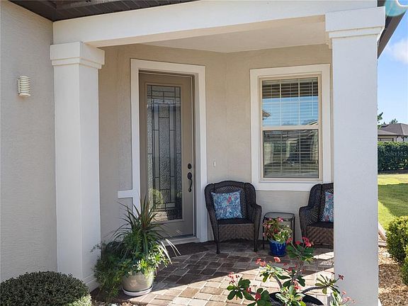 Welcome to this beautifully upgraded Steele Creek model located in the highly sought-after Del Webb Stone Creek, Ocala’s premier 55+ community. This thoughtfully designed home offers 2 bedrooms and 2 bathrooms with an inviting open-concept layout ideal for both everyday living and entertaining. From the moment you arrive, you’ll notice the paver driveway, enhanced landscaping with decorative curbing and stone, and excellent curb appeal. Inside, the home features crown molding and under-cabinet lighting in the kitchen, adding warmth and elegance to the space. The living area opens seamlessly to the outdoors through a 3-panel pocket sliding door, leading to a screened, paver lanai complete with custom blinds—perfect for enjoying Florida living year-round. The spacious primary suite includes a stylish barn door leading to the ensuite bathroom with a tiled walk-in shower. The second bathroom also features a tiled shower, offering comfort and convenience for guests. This home is loaded with premium upgrades, including a water softener, whole-house surge protector, lightning protection system, and a UV light in the air handler for enhanced air quality. The extended 4-foot garage is equally impressive, featuring epoxy floors, a utility sink, and an electric garage screen door. Residents of Del Webb Stone Creek enjoy exceptional amenities, including multiple clubhouses, indoor and outdoor pools, state-of-the-art fitness centers, pickleball and tennis courts, bocce, softball, scenic walking trails, an on-site restaurant and bar, and a wide variety of clubs and social activities—all designed to support an active, resort-style lifestyle. This move-in-ready home combines quality upgrades with an outstanding community—ready for you to start enjoying the Stone Creek lifestyle.