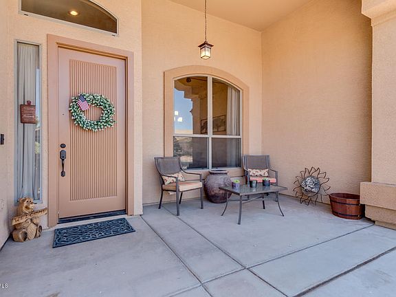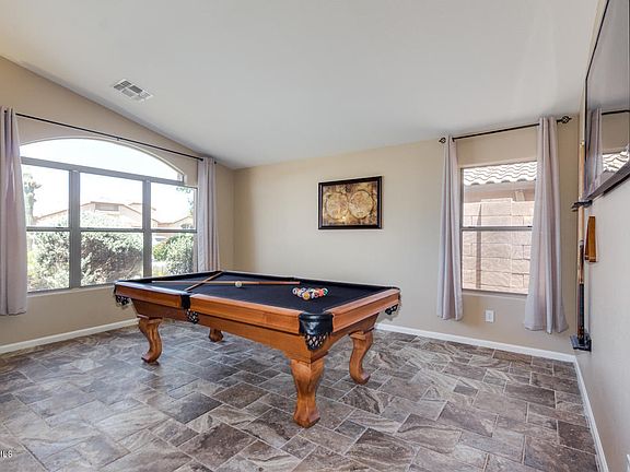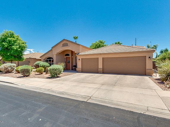 Impressive luxury home with unbelievable upgrades in desirable Mesa. Low maintenance desert front landscaping and 3 car garage. Sophisticated interior from the moment you walk in. Featuring 4 bed, 2 bath, vaulted ceilings, archways throughout, beautiful stone fireplace in family room, breakfast nook looking out to luscious backyard, and living/dining room. Kitchen offers sparkling stainless steel appliances, induction stove/convection oven, island with breakfast bar, granite counter-tops, tiled back-splash, recessed lighting. Double-door master suite has a lavish full bath with dual sinks, garden tub, step-in shower, and walk-in closet. Gorgeous backyard with covered patio, solar panels, and refreshing blue pool is just perfect for gatherings! Soft water unit does not convey.