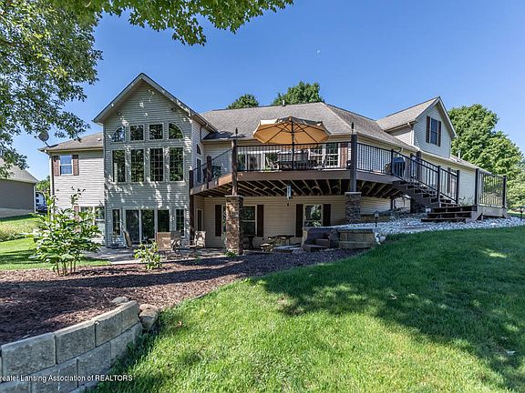 LIVE AT THE LAKE. ALL SPORTS RAINBOW LAKE. Just 45 minutes from Lansing. 100 Feet of Water Frontage with OVER AN ACRE of Manicured Lake Front Property. Come see this Fabulous Custom Built WALKOUT RANCH! This Home features 4 Bedrooms, 3.5 Bathrooms with over 3700 Square Feet of Finished Living Space to enjoy and entertain in. Step into the Foyer that looks into the Family Room with 12 Foot Ceilings with Marvelous Floor to Ceiling Windows that provide an awesome Lake View. Hardwood Floors throughout and into the Study Room. Spacious Kitchen and Gathering Area, offers an Island, newer Appliances, Ceramic Floors through to the Eating area, Slider off to the 500 square foot Deck. Wonderful 1st Floor Laundry Area with Storage. 1st Floor Master Suite offers a luxurious Soaker Tub and a separate Shower. The upper spacious Bedroom offers its own separate Full Bath. The Walkout Lower Level offers two more additional Bedrooms and a Full Bath. Walkout area is all ceramic floors and has a Woodstove & Plenty of room for recreation & or even more seating for Eating if you wish to Entertain on Lower level! There is even an extra Finished Room that can be used as an Exercise Room or another Den/Study Area! Other Lower Level Features are a Kitchenette Area and an EXTRA Washer and Dryer hook up, and wash tub in the large Storage Room. The Exterior Deck and Patio Area are a great place to enjoy the Lake View. There is a gentle slope to the Lake and Dock. Newer Rosetta Stone seawall & lakeside 430 square foot patio & fire pit area, along with the Captains Choice Dock. Oversized garage is heated separately, with Hot & cold water. There is a 12x16 lakeside storage Barn & 16x6 wood shed. POLE barn available soon, on a separate lot. RECENT UPDATES.. Appliances 2015..fridge, range, DW, & Micro 2016 Washer & Dryer 2019 Water Softener & WHOLE HOUSE GENERATOR, Furnace & A/C THIS HOME HAS FIBER OPTICS!! LIVE AT THE LAKE!! Brand NEW roof was just installed!
