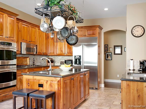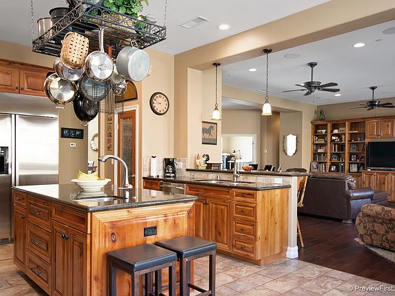 This custom built home features many upgrades that will leave you breathless. Wood flooring, Rustic Cherry cabinets accent the stainless steel appliances, walk in pantry, quarts counter tops. Dining area in kitchen and a formal dining room. Large 11x7 laundry room with granite counters & custom cabinets. Extra wide hallways, custom built in cabinetry throughout to accommodate all your storage needs. Designer lighting and fans in every room. Well with 10,000 gal tank & storage. Wrap around porch!!